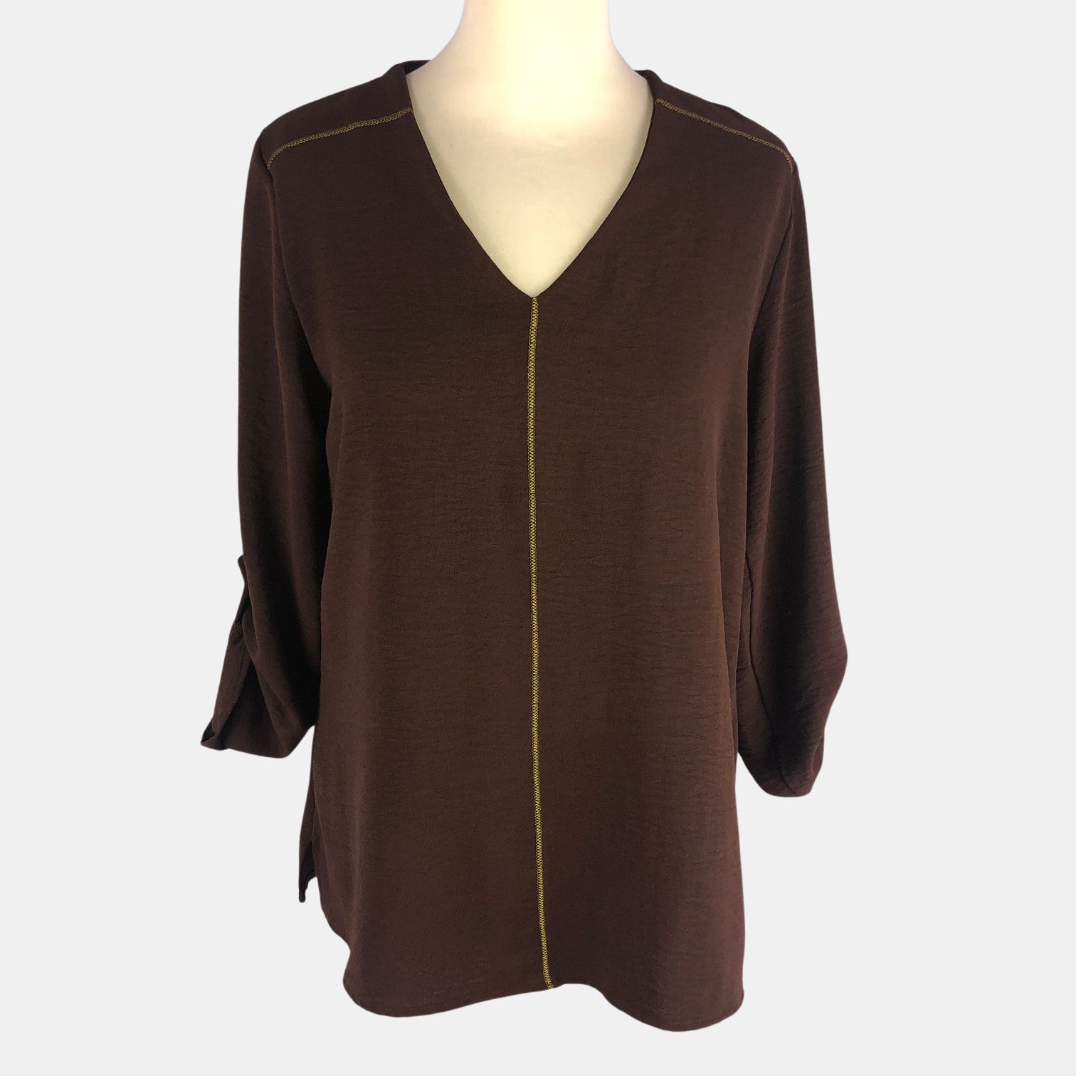 Blusa marrón con pespuntes en verde lima y manga para fruncir