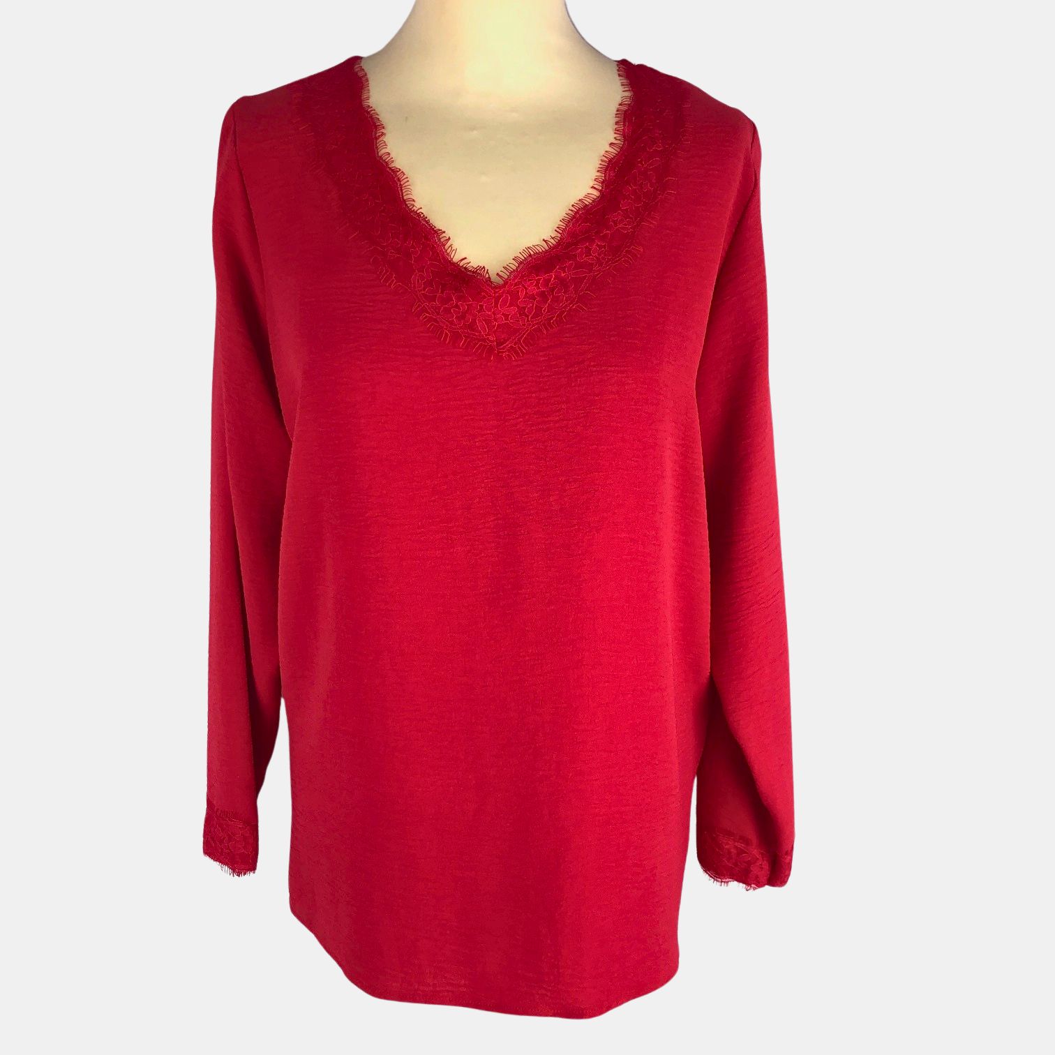 Blusa roja con puntilla de encaje en el escote de pico y puños