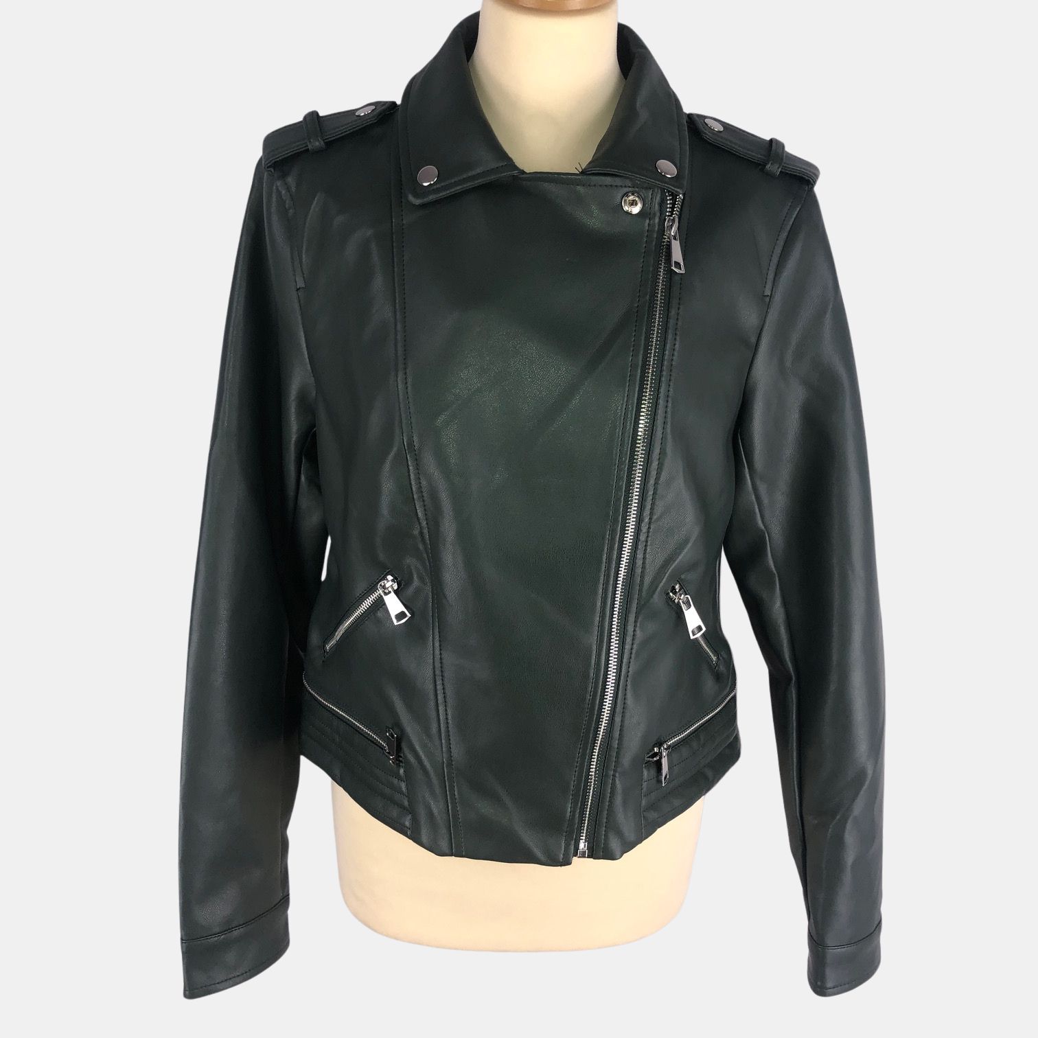 Cazadora polipiel en verde cruzada con cierre de cremallera