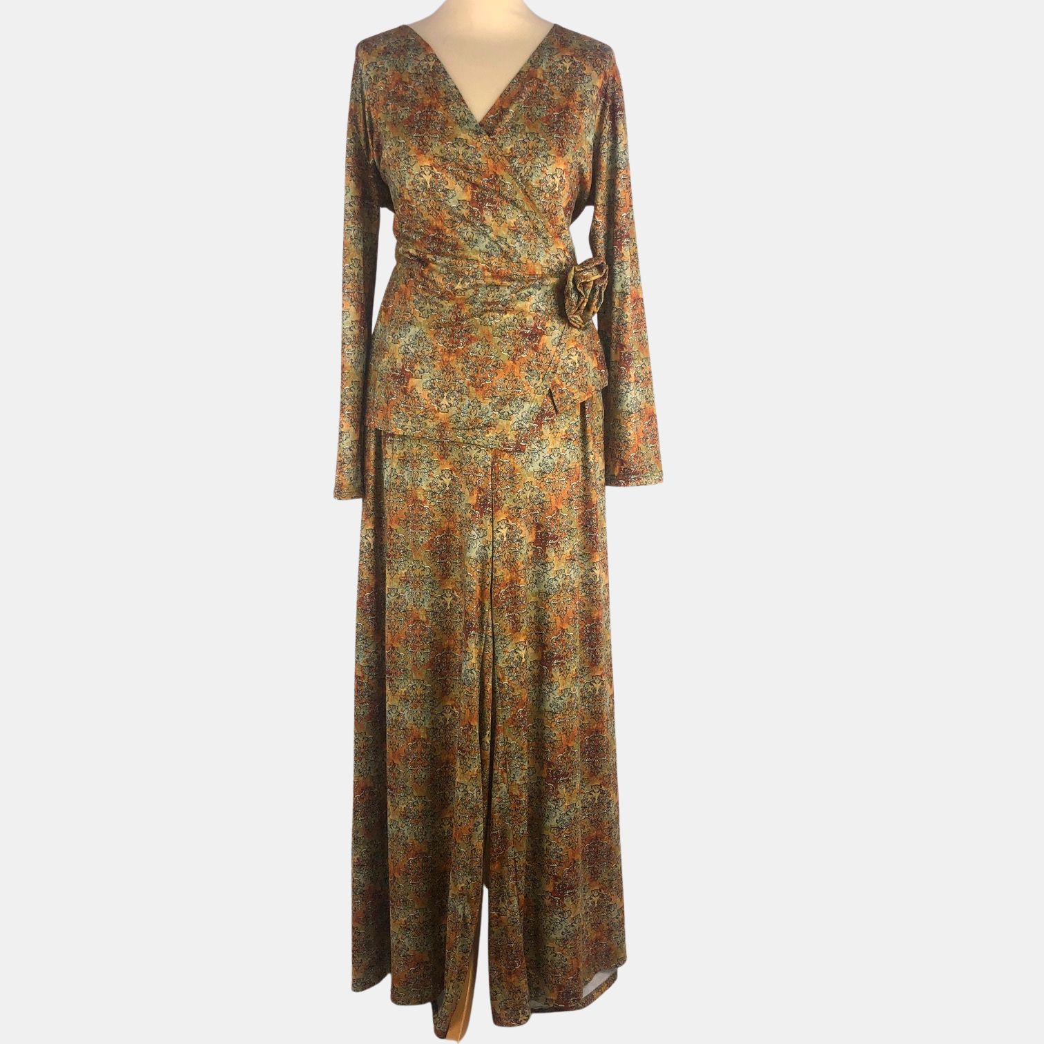 Conjunto de pantalón ancho y blusa cruzada con adorno de flor en estampado verde y teja
