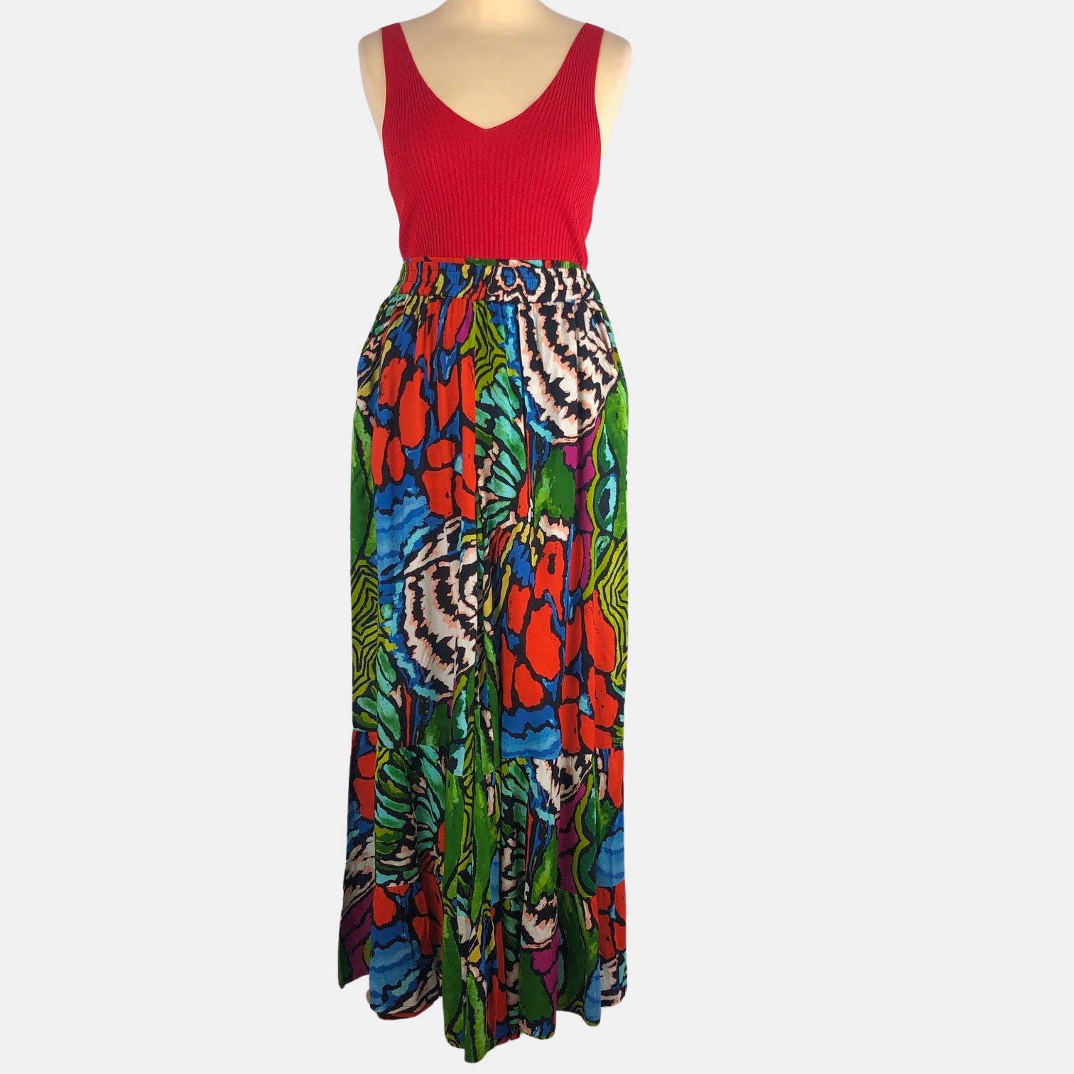 Pantalón ancho volante en negro con dibujos abstractos multicolor