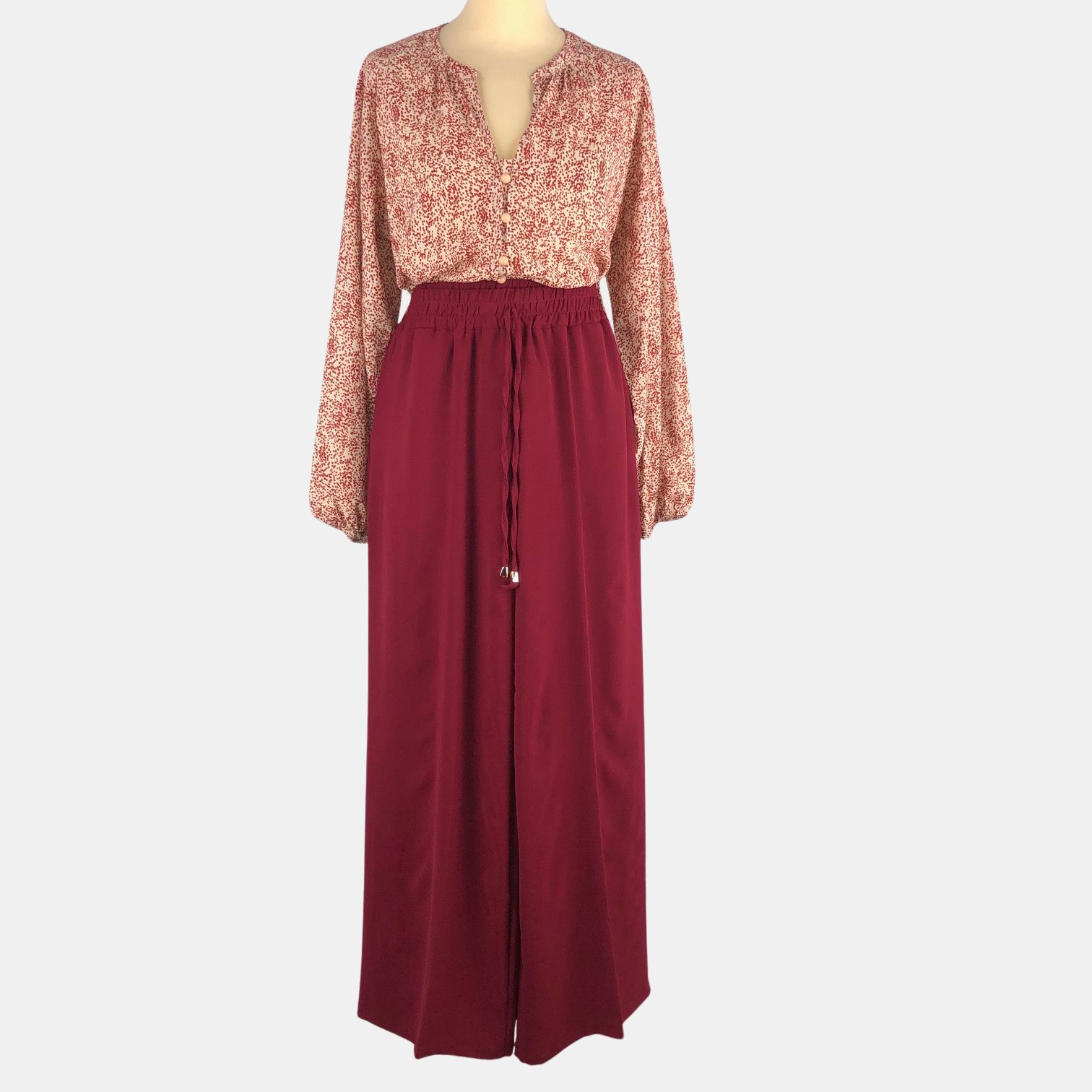 Pantalón satén en granate con cintura elástica y bolsillos laterales