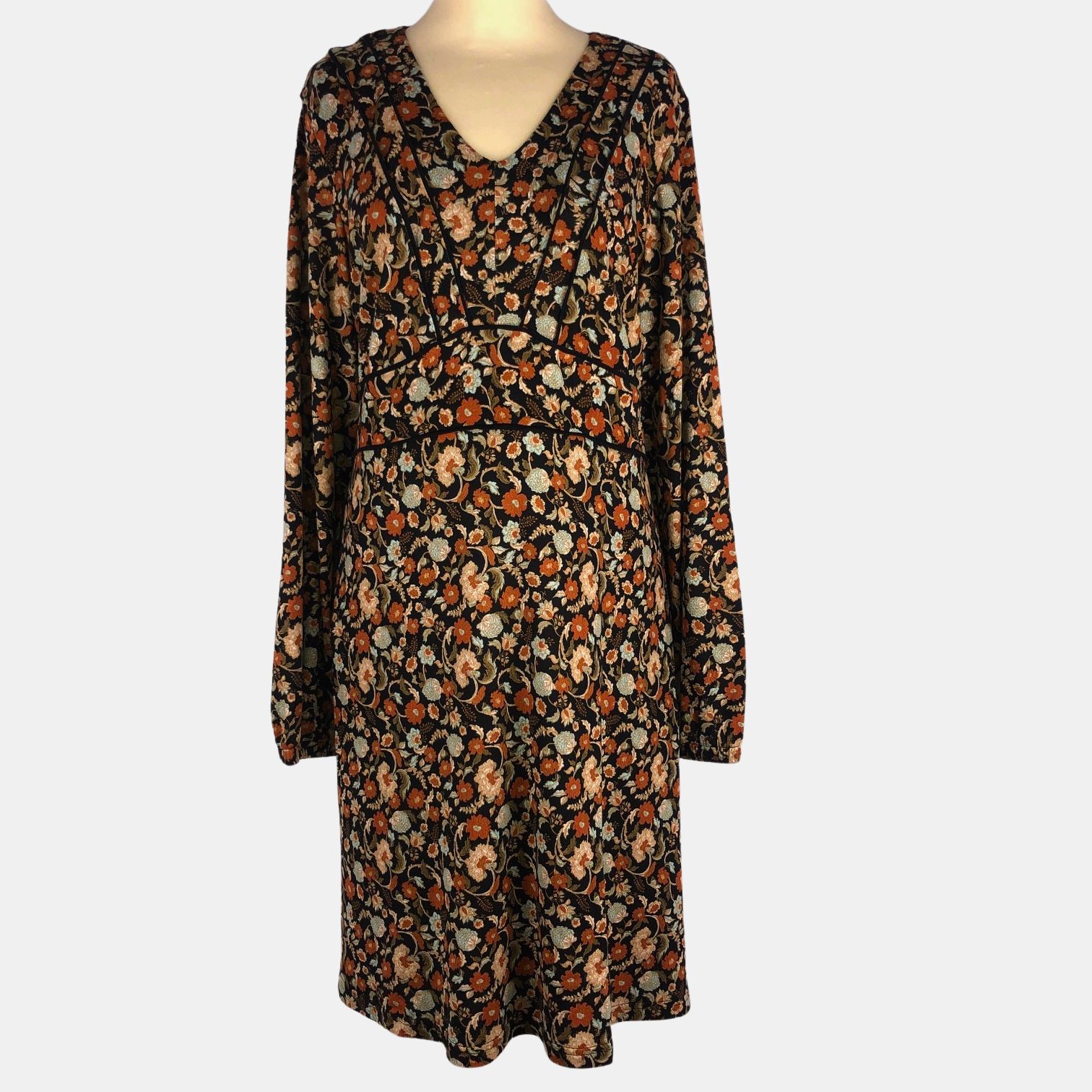 Vestido de punto con estampado floral tonos naranjas con vivo negro en el pecho y corte con la cintura